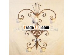 Wall sconce with 5 glasses 1.Patinaed finish brings warmth to awall space 2.Holds a tealight candle in each of the 5 cupsabout metal wall sconce with 5 glass cups
